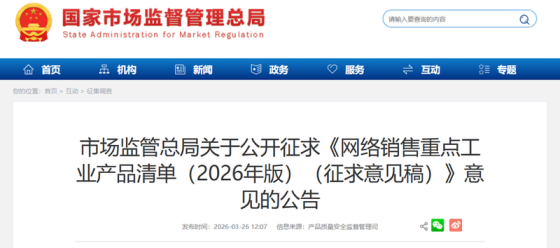 根据《网络销售重点工业产品质量安全监督管理规定》(国家市场监督管理总局令第110号),市场监管总局制定、调整并发布《网络销售重点工业产品清单》。按照规定要求,市场监管总局研究制定了《网络销售重点工业产品清单(2026年版)(征求意见稿)》,现向社会公开征求意见。一、通过登录国家市场监督管理总局官方网站(网址:http://www.samr.gov.cn),在首页“互动”栏目中的“征集调查”提出意见。二、通过电子邮件发送至xiaofeipinchu@samr.gov.cn。邮件主题请注明“《网络销售重点工业产品清单(2026年版)》公开征求意见”字样。三