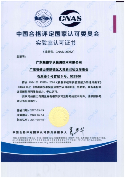 广东顺德华认检测有限公司,是一家严格按照ISO/IEC 17025的要求建立,经中国合格评定国家认可委员会(CNAS)认可和国际实验室认可合作组织(ILAC)认可的,已获得CMA计量认证资质,专注于产品检测的第三方检测机构。 实验室于2015年开始着手筹建,严格按照ISO/IEC17025要求建标。2016年初建立起管理体系,并于2016年12月通过CMA资质认定,2017年初通过CNAS认可,拥有国际IEC标准、欧盟EN标准、中国GB标准以及美国UL、加拿大CSA、澳大利亚AS、新西兰NZS、日本J/JIS、泰国TIS、沙特SASO、印度IS、马来西亚MS、印尼SNI、越南TCVN、菲律宾PNS、英国BS、德国VDE、海湾七国GCC等标准的检测能力。 华认实验室的创立,为服务企业提供产品开发阶段的技术支持、批产前的样品确认、认证前评估、产品认证及检测、质量监督、出口认证检测、实验室建标等一站式服务。 |